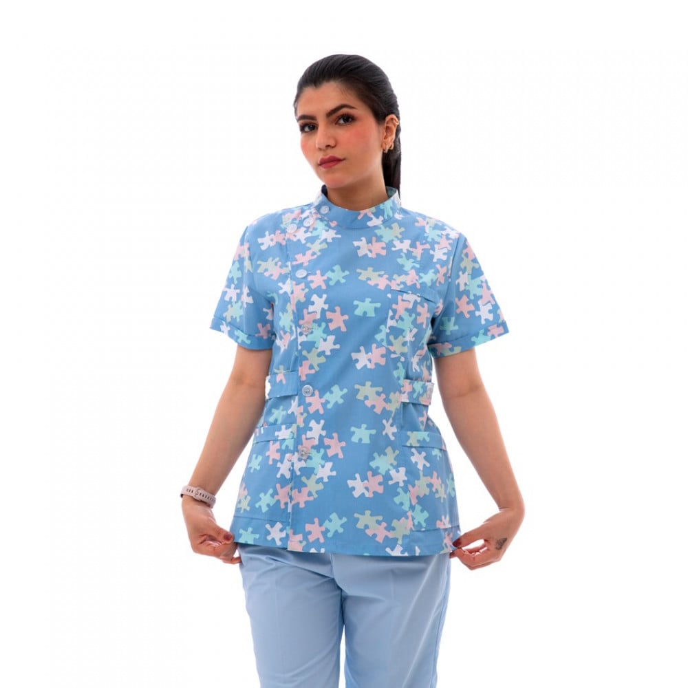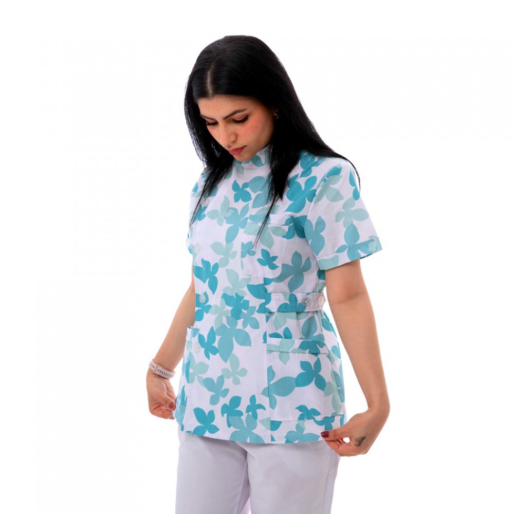 سكراب نسائى منقوش بقصة صيني، مصمم مخصوص للمرأة العملية اللي تبغى راحة وأناقة في نفس الوقت. البلوزة والبنطلون متناسقين بشكل يضمن لك حرية الحركة وطلة مرتبة طول دوامك.